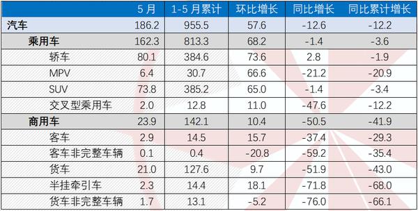 5月,汽车产销分别完成192.6万辆和186.2万辆, 环比分别增长59.7%和57.6%,同比分别下降5.7%和12.6%,降幅比上月收窄40.4和35个百分点。