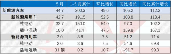 5月,新能源汽车产销分别完成46.6万辆和44.7 万辆,同比均增长1.1倍;1-5月,新能源汽车产销分别完成207.1万辆和200.3万辆,同比均增长1.1倍。